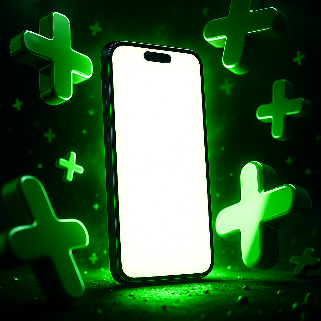 Stylish smartphone mockup featuring a blank screen surrounded by green plus signs, ideal for tech promotions or app showcase. The vibrant colors and clean design enhance visual appeal.