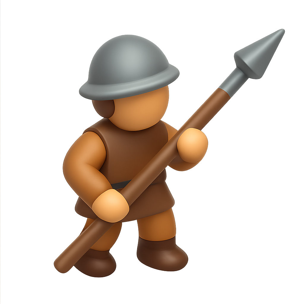A stylized 3D character icon depicting a warrior holding a spear, wearing a helmet and brown attire. The figure stands in a dynamic pose, showcasing a playful design.