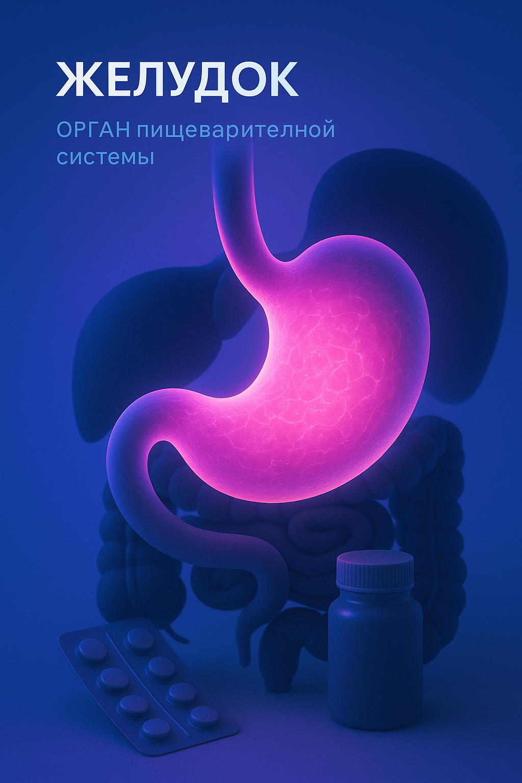 The image showcases a glowing stomach set against a solid blue background, highlighting its neon-pink glow. Surrounding elements include a pill bottle and a strip of tablets, creating a meaningful composition.