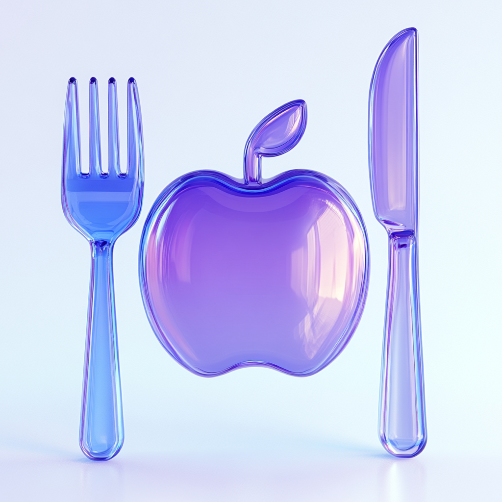 A modern 3D graphic featuring a translucent apple alongside a fork and knife, showcasing a playful and artistic interpretation of dining. Ideal for food-related content.