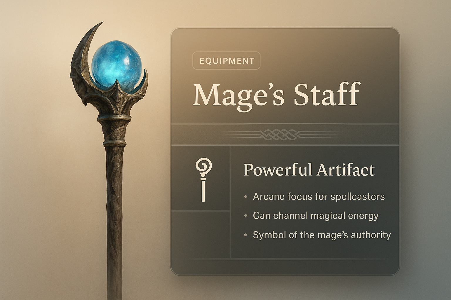 A beautifully crafted mage's staff with a glowing blue orb at the top, accompanied by a stylish information overlay that details its magical properties.