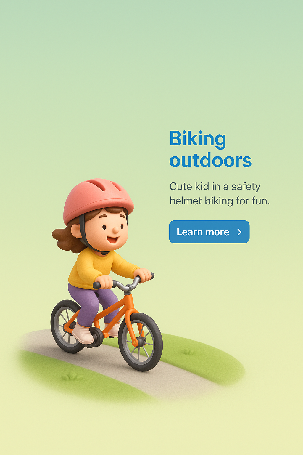A charming 3D scene of a little girl joyfully riding her bicycle outdoors. She wears a safety helmet and is captured in a zoomed-out perspective, showcasing her playful interaction with the environment.