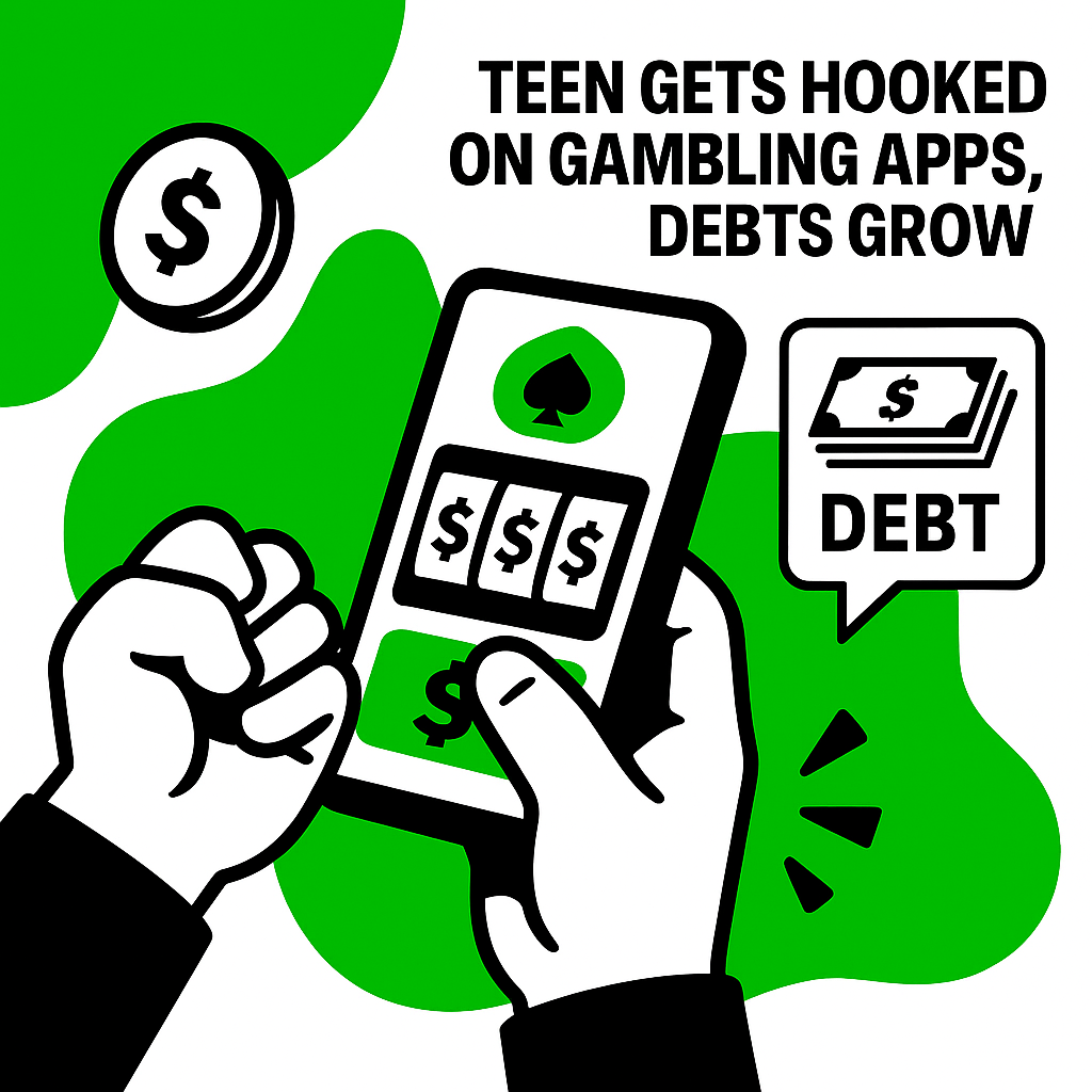 A bold and illustrative graphic highlighting the dangers of gambling apps among teens, featuring a smartphone and money symbols. Ideal for awareness campaigns.