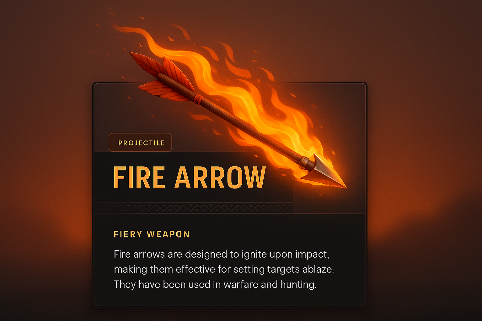 /Collection: /by davooda/Type: PNG/A visually striking 3D illustration of a fire arrow, featuring flames and a dark background. It includes a text block that describes the arrow's historical use in warfare and hunting.