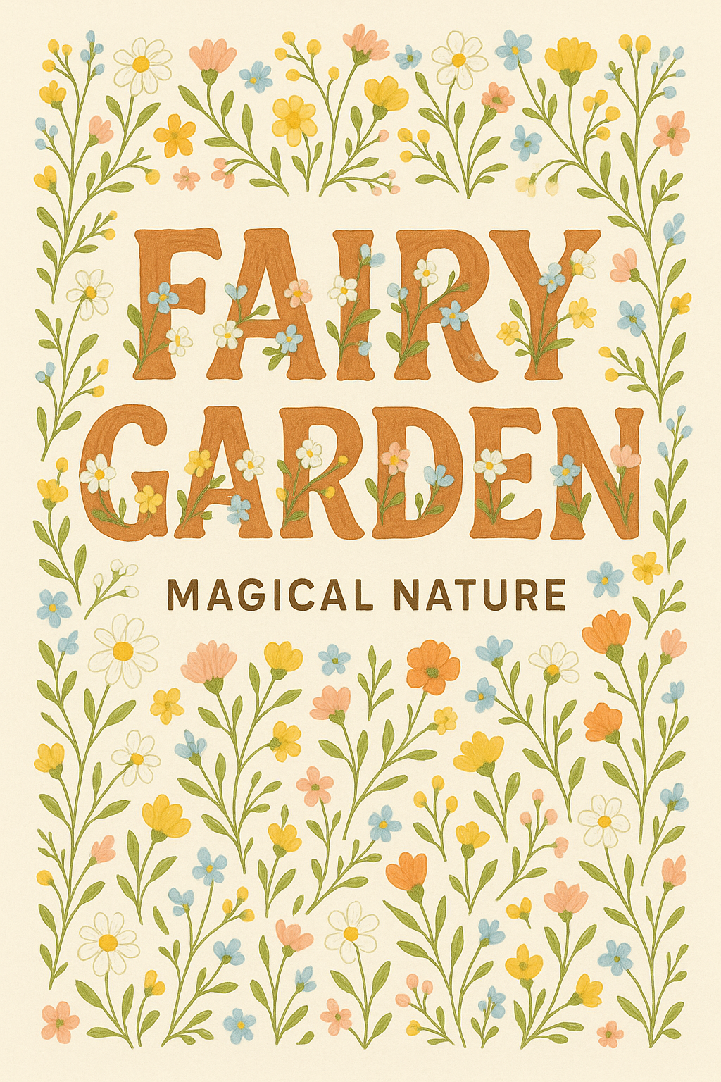 Charming illustration featuring the title 'Fairy Garden' surrounded by colorful floral designs, ideal for children's book covers or nature-themed decor.