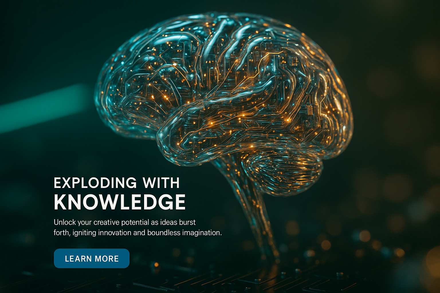 /Collection: /by davooda/Type: PNG/A hyperrealistic depiction of a brain exploding with knowledge, featuring intricate details of glowing circuits and mechanical elements, set against a soft, misty background.