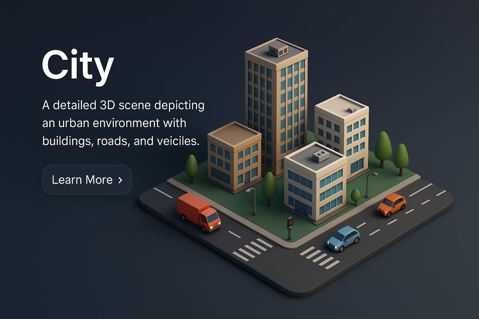 A captivating 3D representation of a cityscape featuring buildings, roads, and vehicles. The scene is designed in a realistic style, emphasizing depth and detail.
