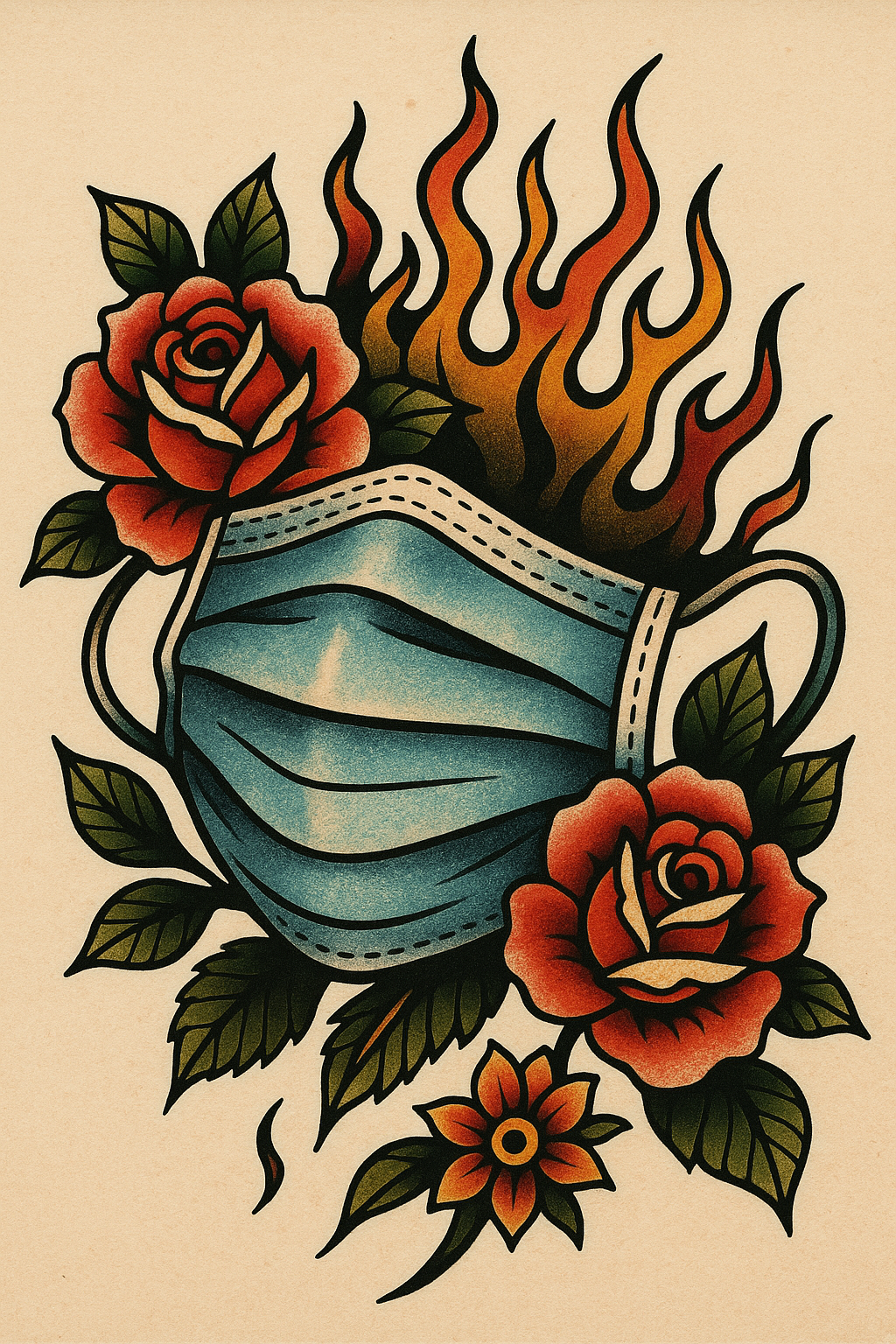 /Collection: /by davooda/Type: PNG/This is an artistic tattoo-style illustration featuring a blue mask intertwined with roses and flames, conveying themes of resilience and beauty. Suitable for art blogs or merchandise.