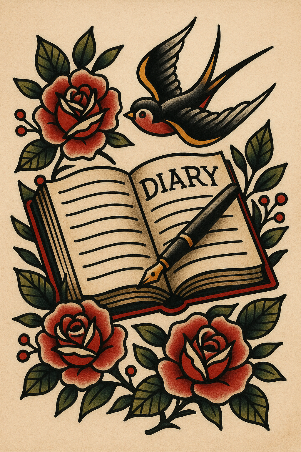 A vibrant tattoo-style graphic featuring an open diary, a swallow, and roses. Ideal for art enthusiasts, tattoo designs, or decorative purposes.