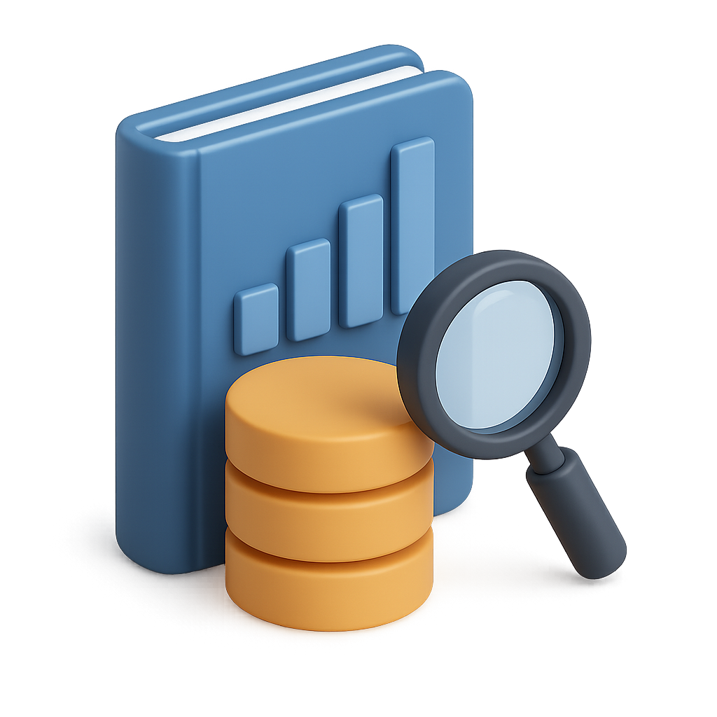 /Collection: /by davooda/Type: PNG/A visually striking 3D icon depicting data mining, featuring stacked orange disks, a blue book with bar graphs, and a magnifying glass, all set against a transparent background.