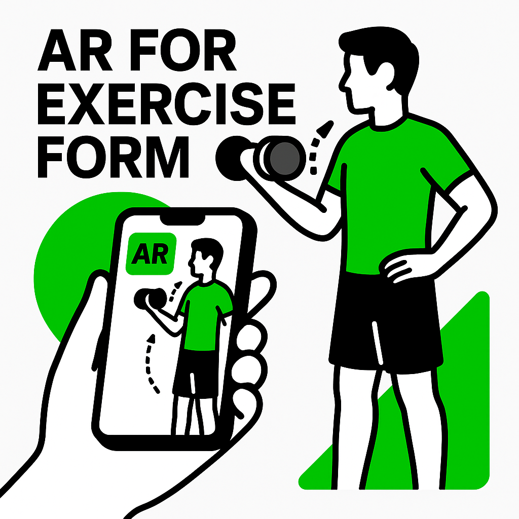 /Collection: /by davooda/Type: PNG/Illustrative graphic showcasing the integration of augmented reality in exercise form training, featuring a person demonstrating a workout with a mobile device displaying AR. Ideal for fitness technology promotions.