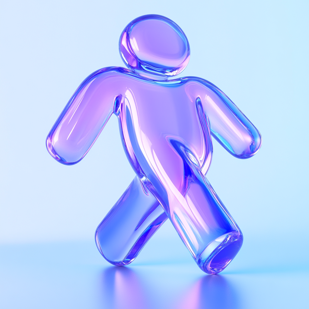 A modern, artistic representation of a walking figure made of translucent glass, showcasing a blend of purple and blue hues. Ideal for creative projects or digital art.