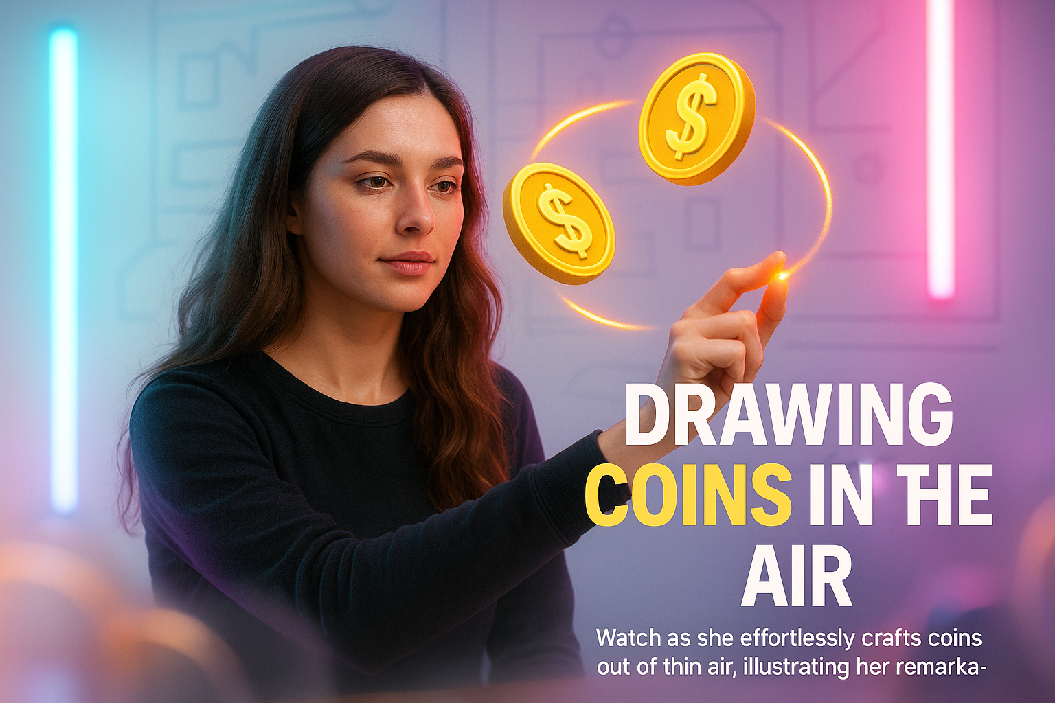 /Collection: /by davooda/Type: PNG/A creative image featuring a young woman seemingly drawing coins in the air, symbolizing creativity and innovation. The vibrant colors and modern design make it suitable for marketing or inspirational content.