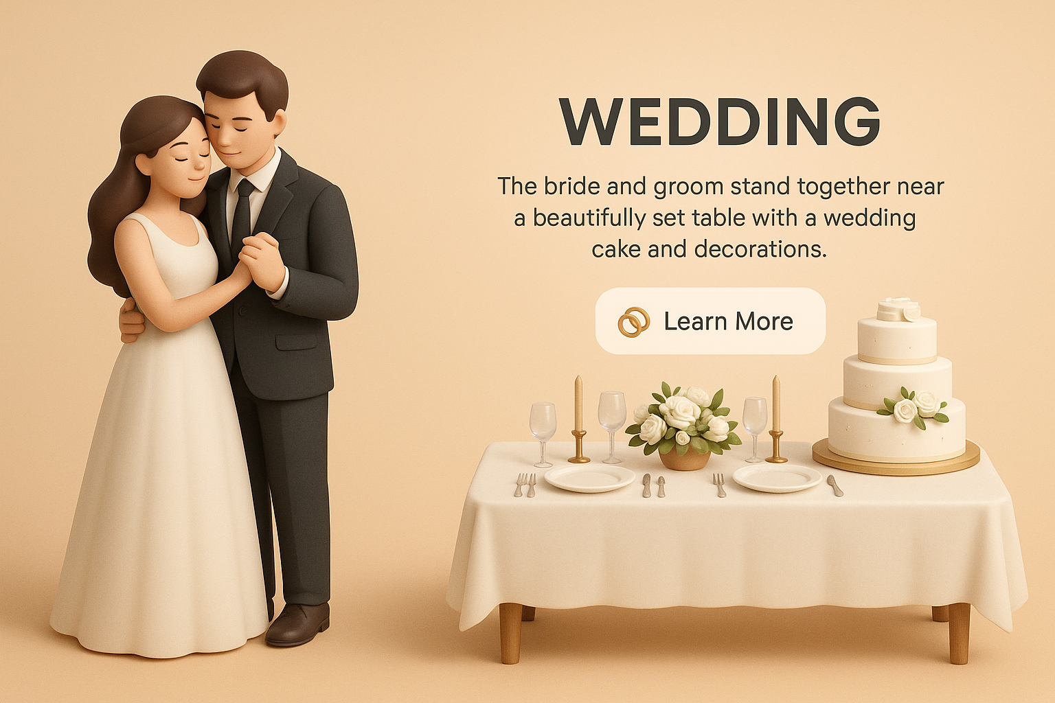 A detailed 3D illustration featuring a bride and groom in a romantic pose near a beautifully arranged wedding table with a cake and decorations, set against a smooth gradient background.