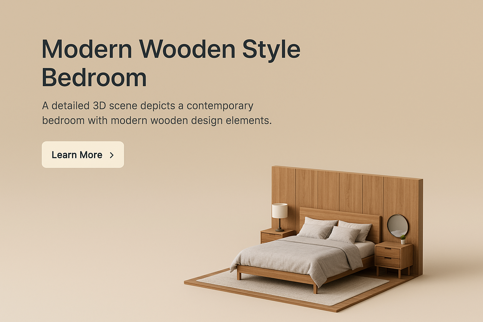 A modern wooden style bedroom presented in a 3D design. The scene captures a cozy yet contemporary ambiance, featuring a stylish bed and minimalist decor elements.