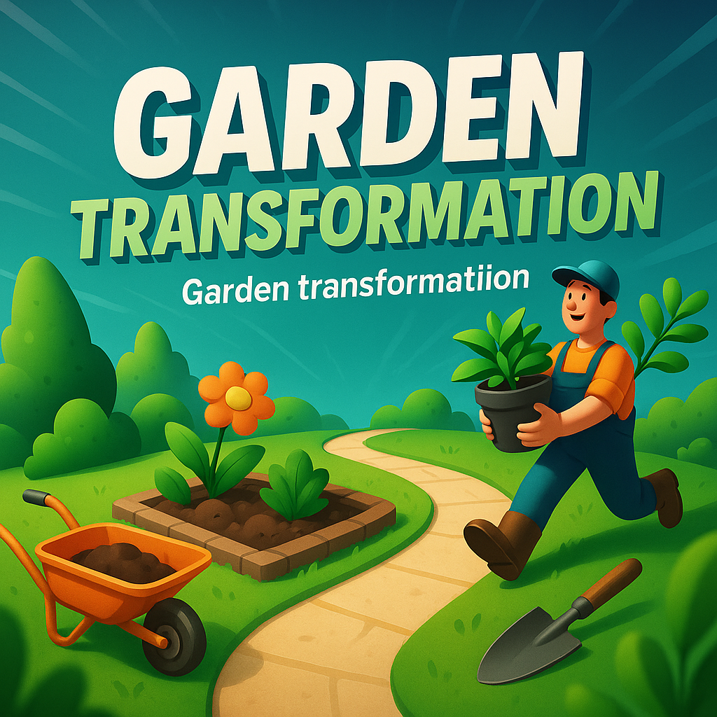 This vibrant illustration depicts a character engaging in garden transformation with tools and plants, ideal for landscaping and gardening content.