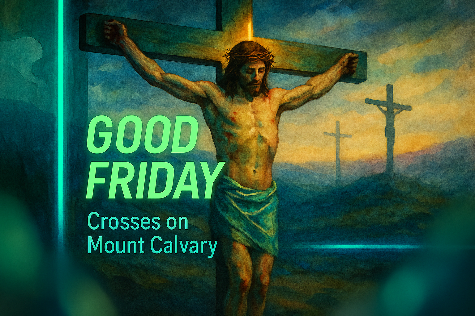 /Collection: /by davooda/Type: PNG/Vivid religious illustration for Good Friday featuring a crucifixion scene with dramatic lighting and a serene background, ideal for church events and spiritual reflections.