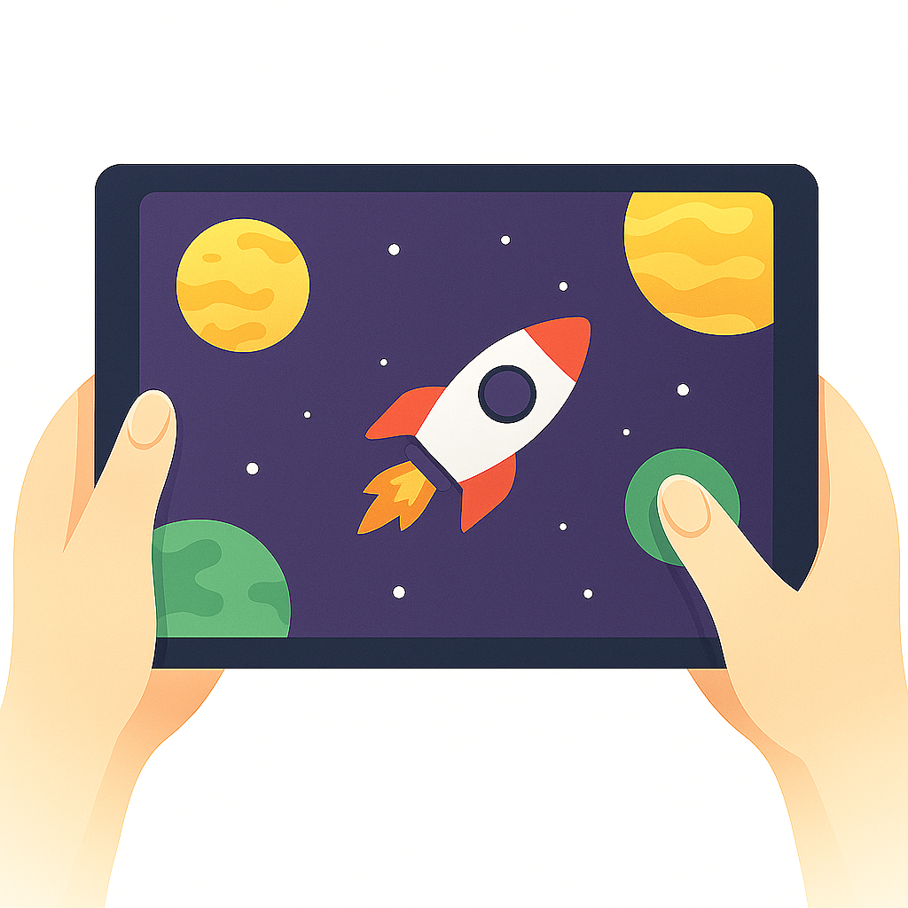 /Collection: /by davooda/Type: PNG/Illustration depicting a rocket launching into space displayed on a tablet. The vibrant colors and playful design make it suitable for educational or promotional content related to technology and exploration.