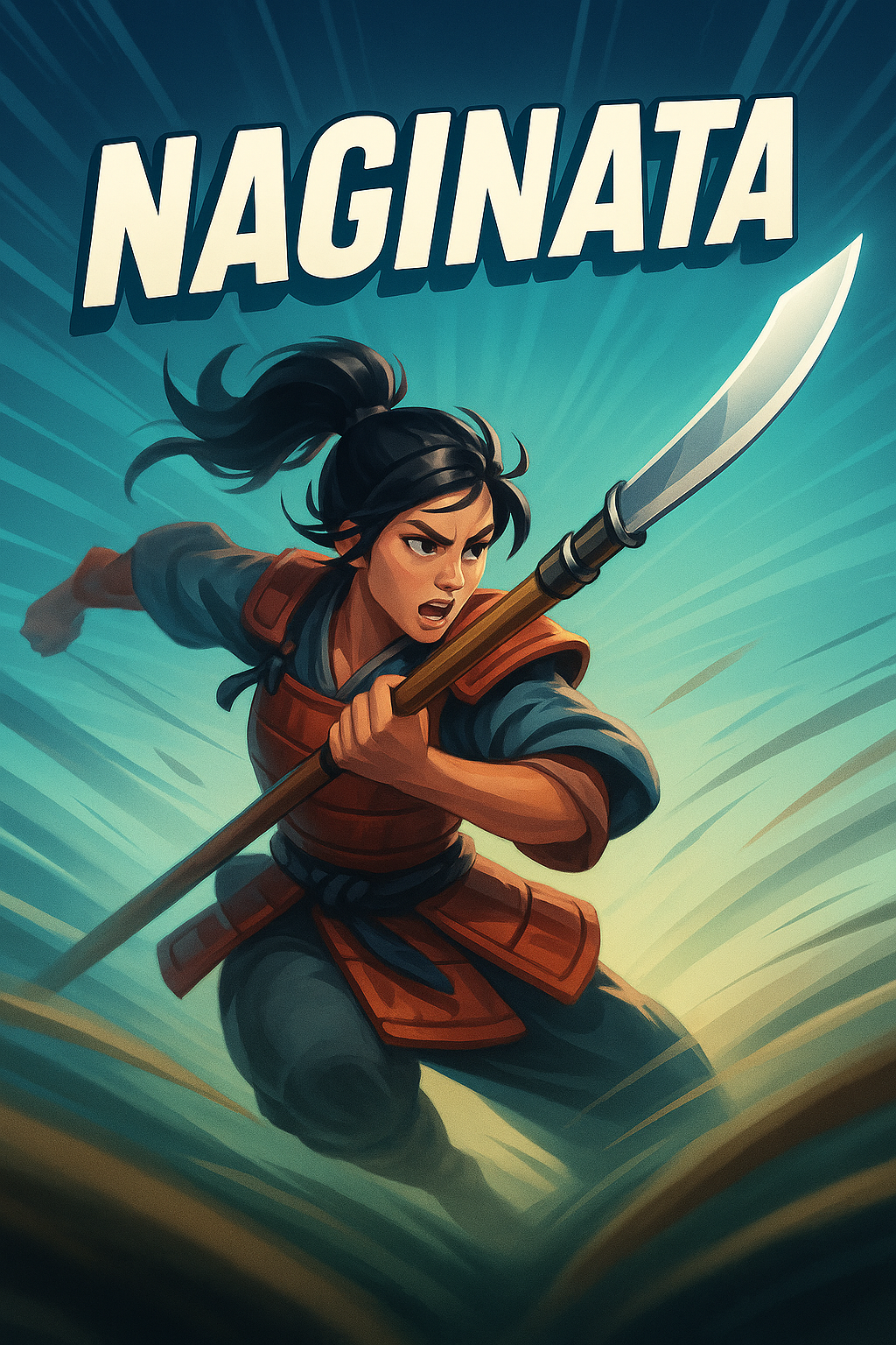 A fierce warrior, wielding a naginata, charges forward with determination. The dynamic background features sweeping lines and vibrant colors, enhancing the sense of movement.