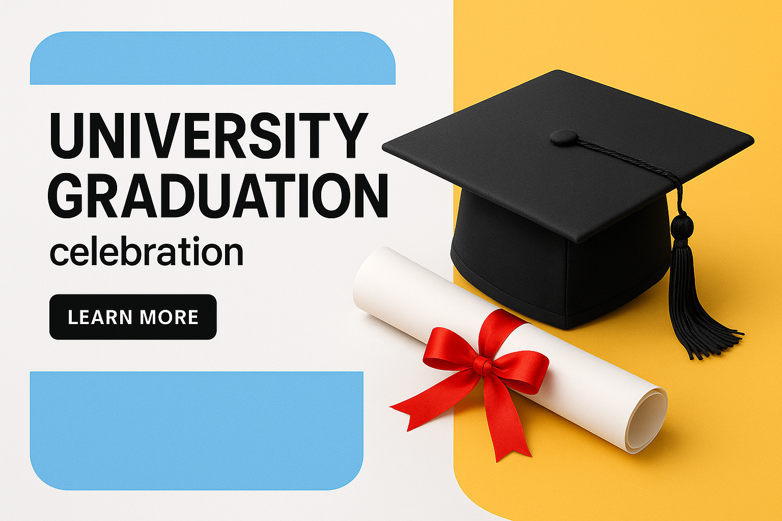 /Collection: /by davooda/Type: PNG/A vibrant graduation celebration design featuring a graduation cap and diploma. The layout is modern with bold typography and a clear call-to-action button, creating a professional look.