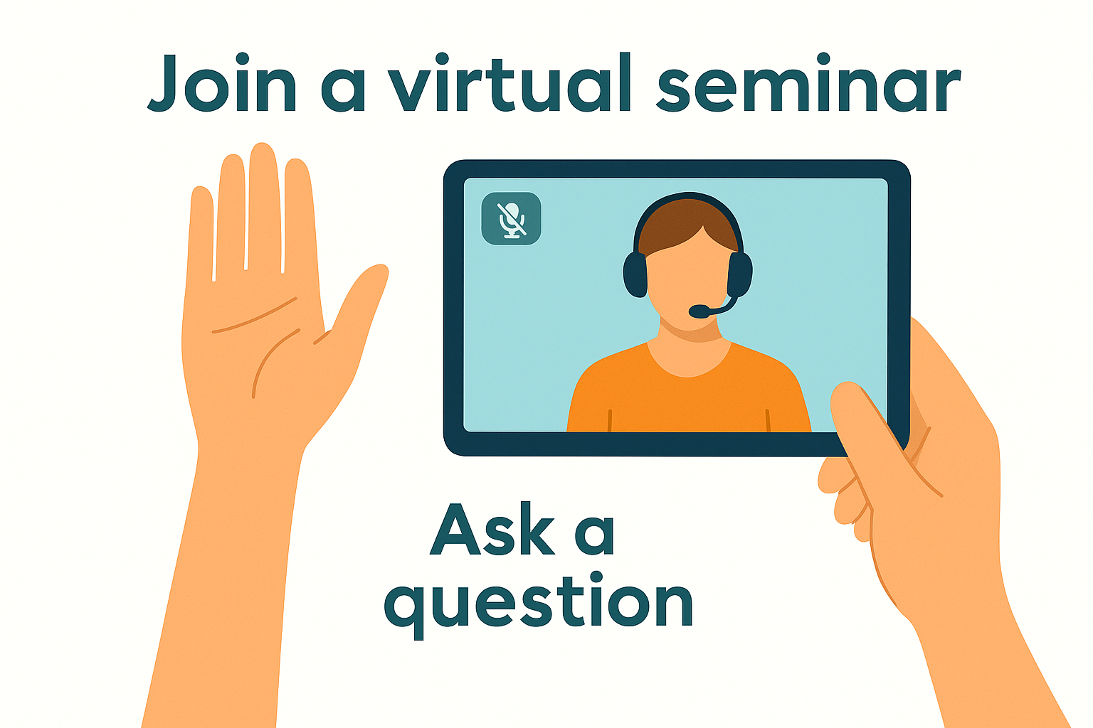 /Collection: /by davooda/Type: PNG/Illustrative graphic inviting viewers to join a virtual seminar, featuring a person in a headset and hands holding a tablet. Ideal for digital marketing and event promotion.
