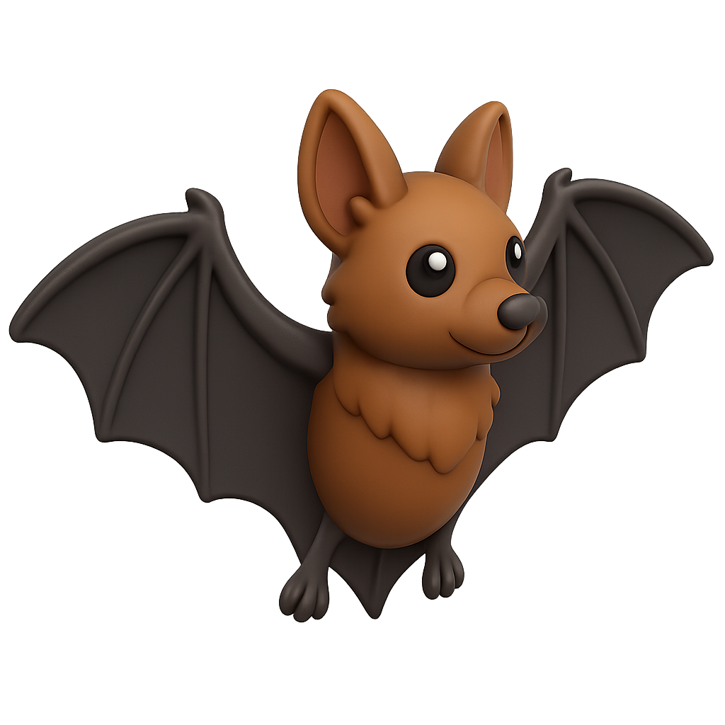 A stylized, cartoonish 3D icon of a flying fox fruit bat, depicted in a three-quarter isometric view with a transparent background, showcasing a smooth, glossy finish.