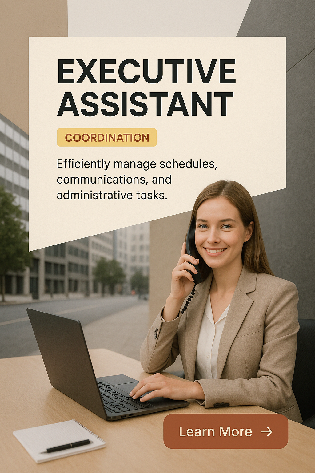 A professional woman in a beige suit sits at a desk, managing tasks as an executive assistant. She speaks on the phone with a background of an urban setting.