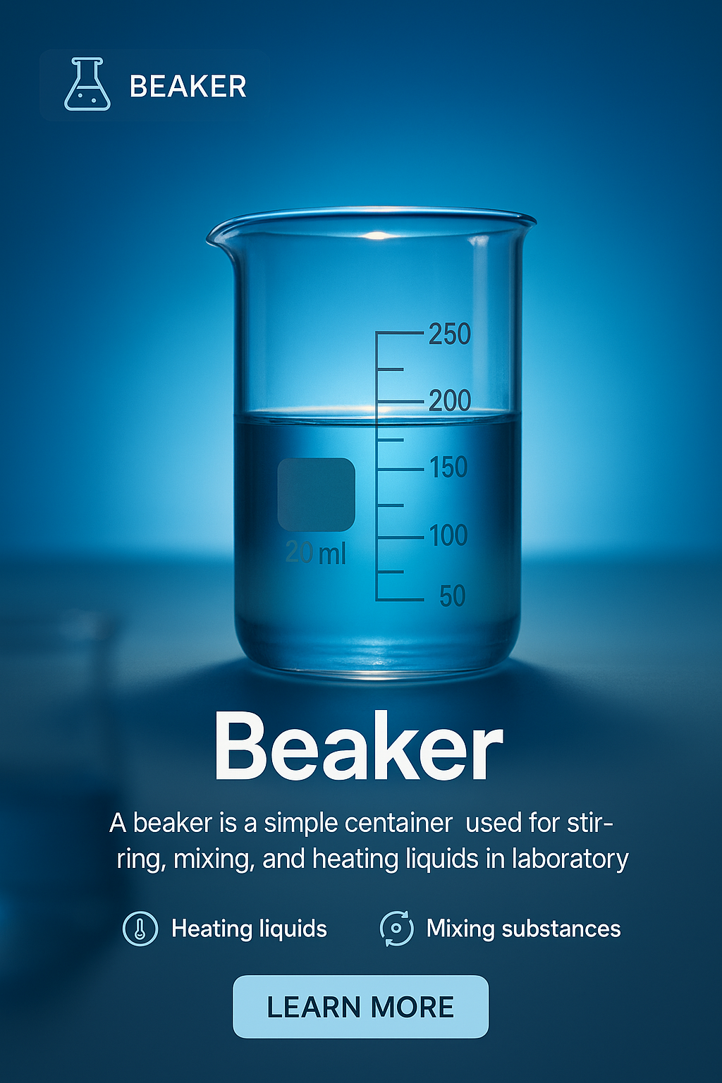 This image features a laboratory beaker filled with liquid, set against a blue background. It serves as an educational graphic for chemistry contexts and laboratory settings.