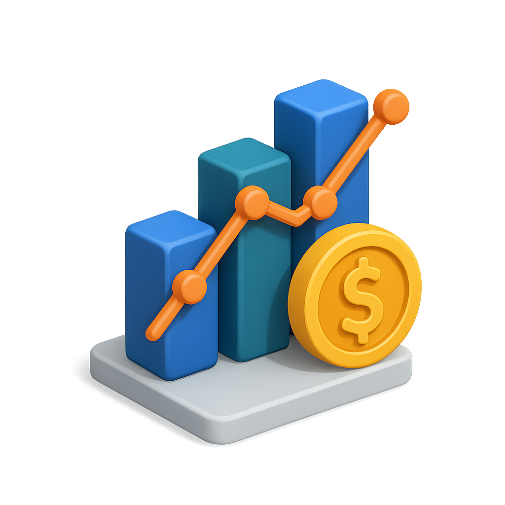 A vibrant 3D icon featuring a growing bar graph in blue and green, accompanied by a golden dollar sign coin. The design is isometric with a transparent background.