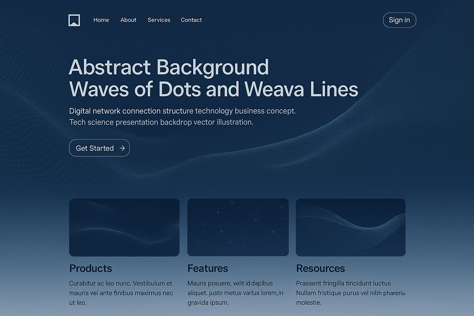 /Collection: /by davooda/Type: PNG/A visually appealing landing page featuring an abstract background of waves and dots, with sections for products, features, and resources, and a clear call-to-action button.