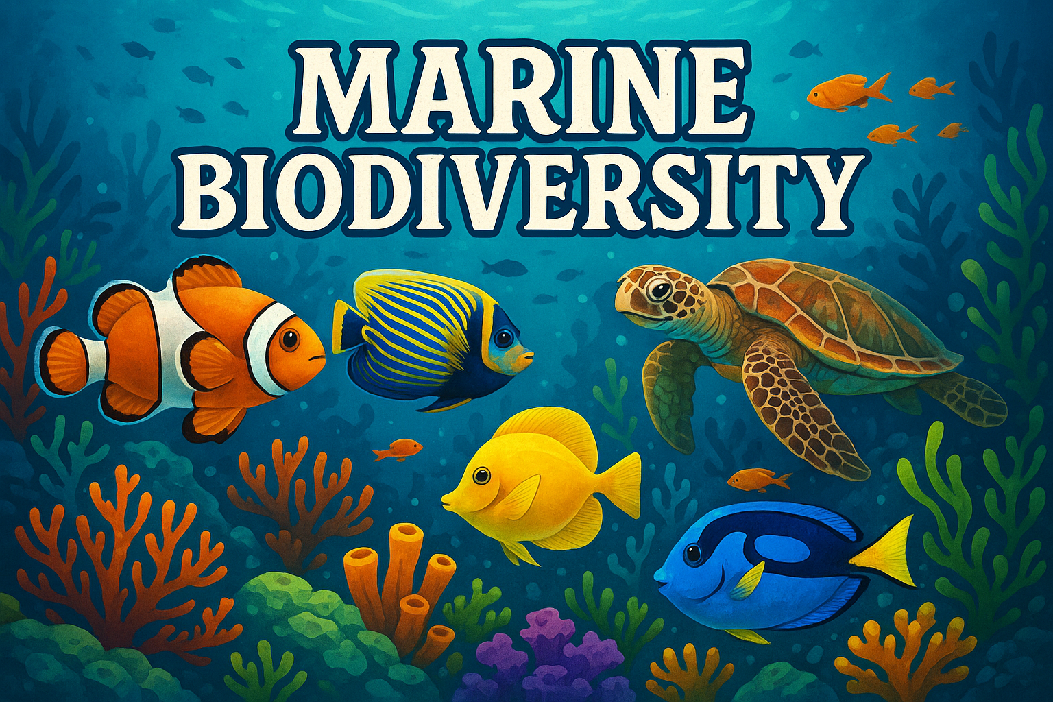 /Collection: /by davooda/Type: PNG/Vibrant illustration showcasing various marine life, including fish and a turtle, emphasizing the theme of biodiversity in ocean ecosystems. Ideal for educational materials or environmental awareness campaigns.