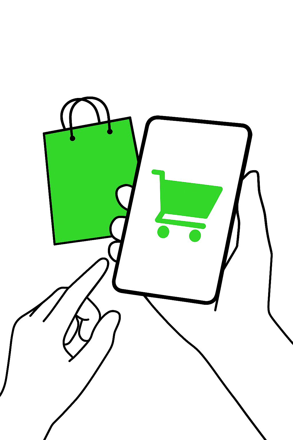 /Collection: /by davooda/Type: PNG/Stylized illustration depicting a smartphone displaying a shopping cart icon alongside a green shopping bag, perfect for digital marketing and e-commerce themes.