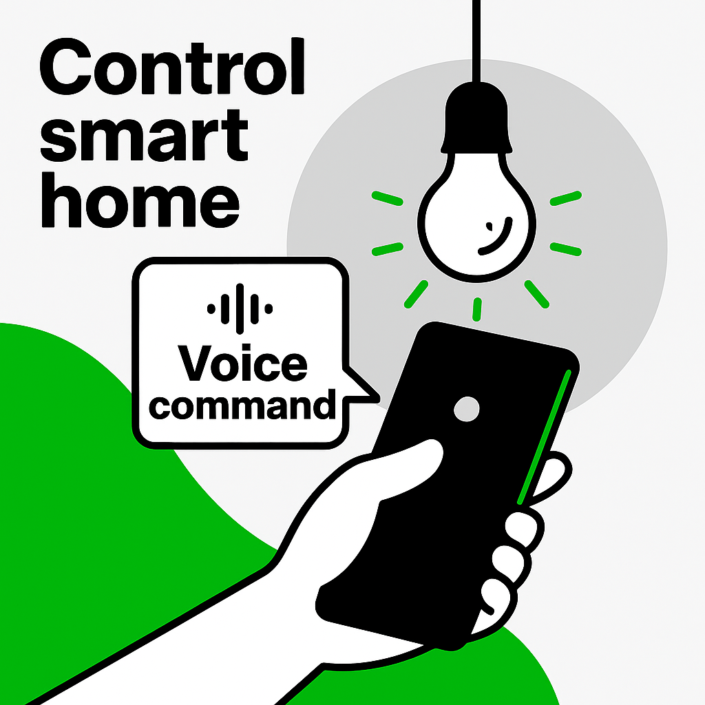 Illustrative graphic showcasing a hand holding a smartphone with a light bulb and voice command concept, ideal for technology and home automation marketing.