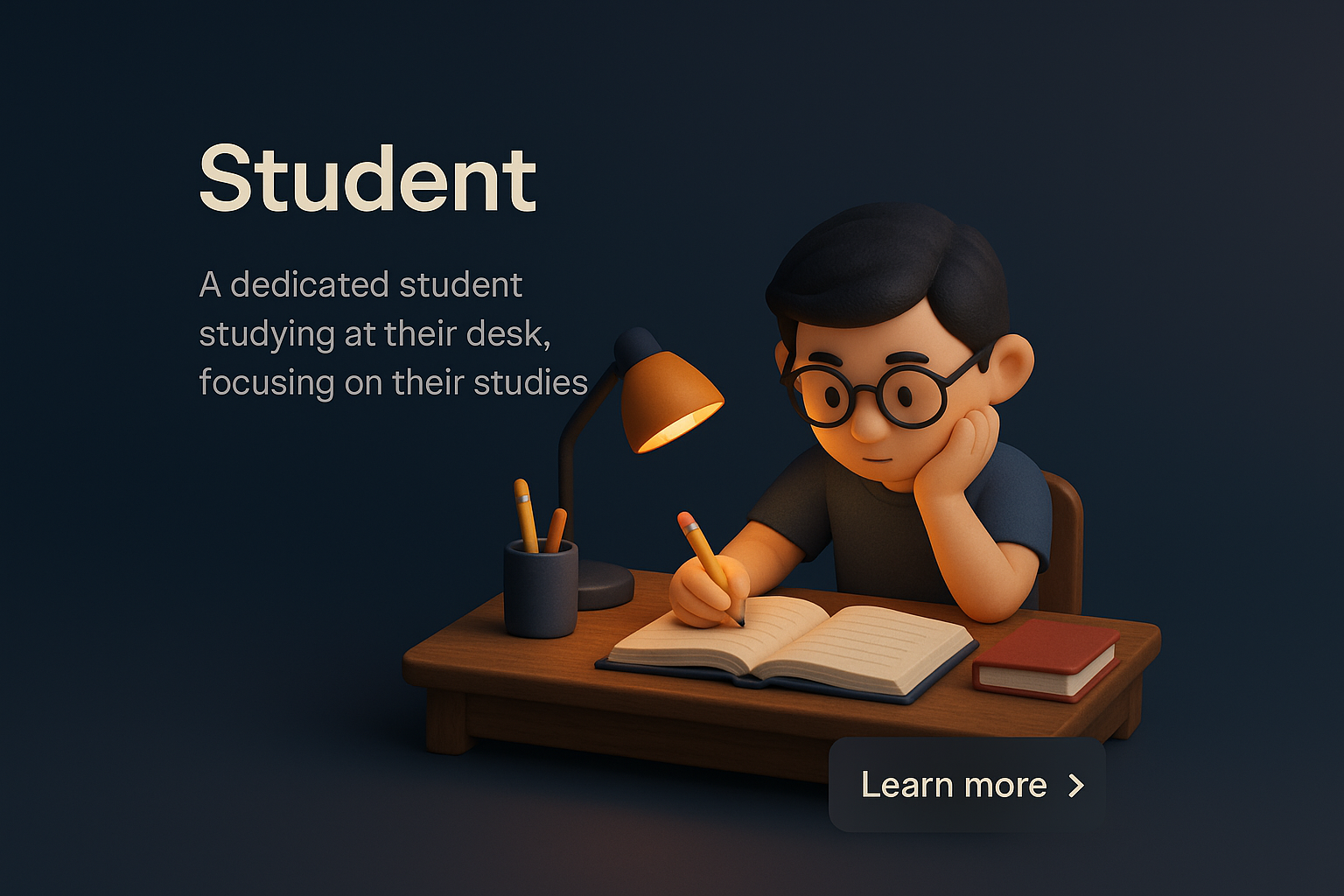 /Collection: /by davooda/Type: PNG/A zoomed-out 3D illustration of a dedicated student at a desk, immersed in studying. The scene features a warm desk lamp, books, and stationery, set against a dark gradient background.