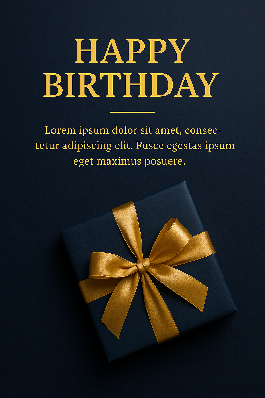 Stylish birthday greeting card featuring a beautifully wrapped gift box with a golden ribbon, perfect for celebrating special occasions with a touch of elegance.
