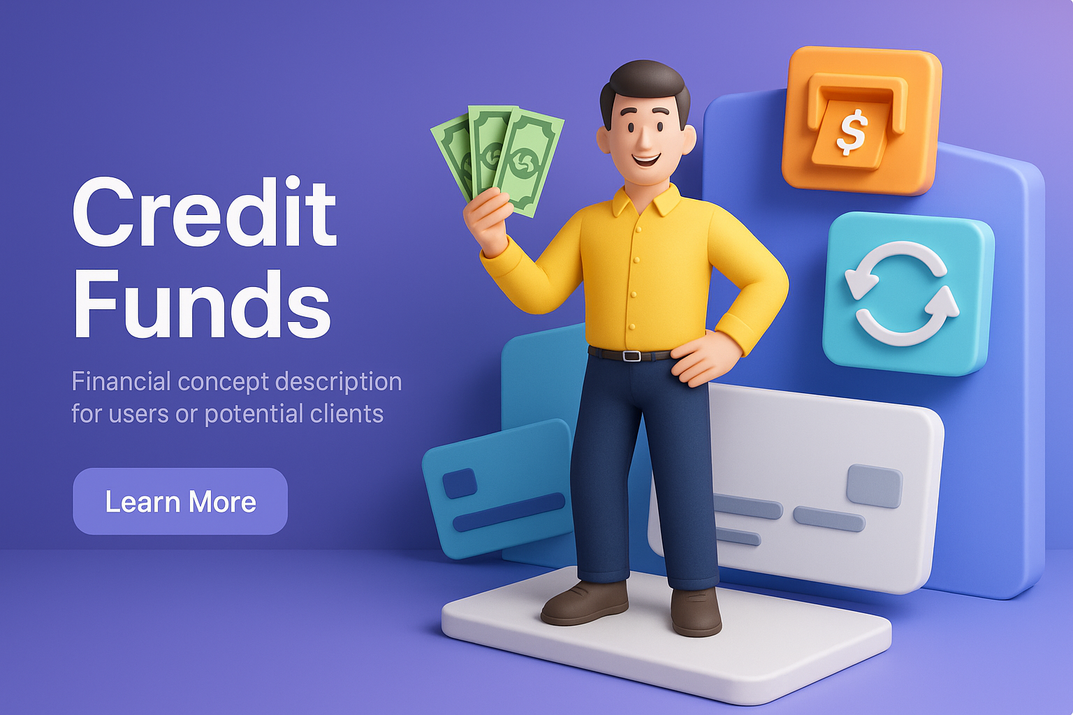 /Collection: /by davooda/Type: PNG/A vibrant 3D graphic illustrating a financial theme with a character holding money, designed for promoting credit funds to users or clients. Ideal for marketing materials.