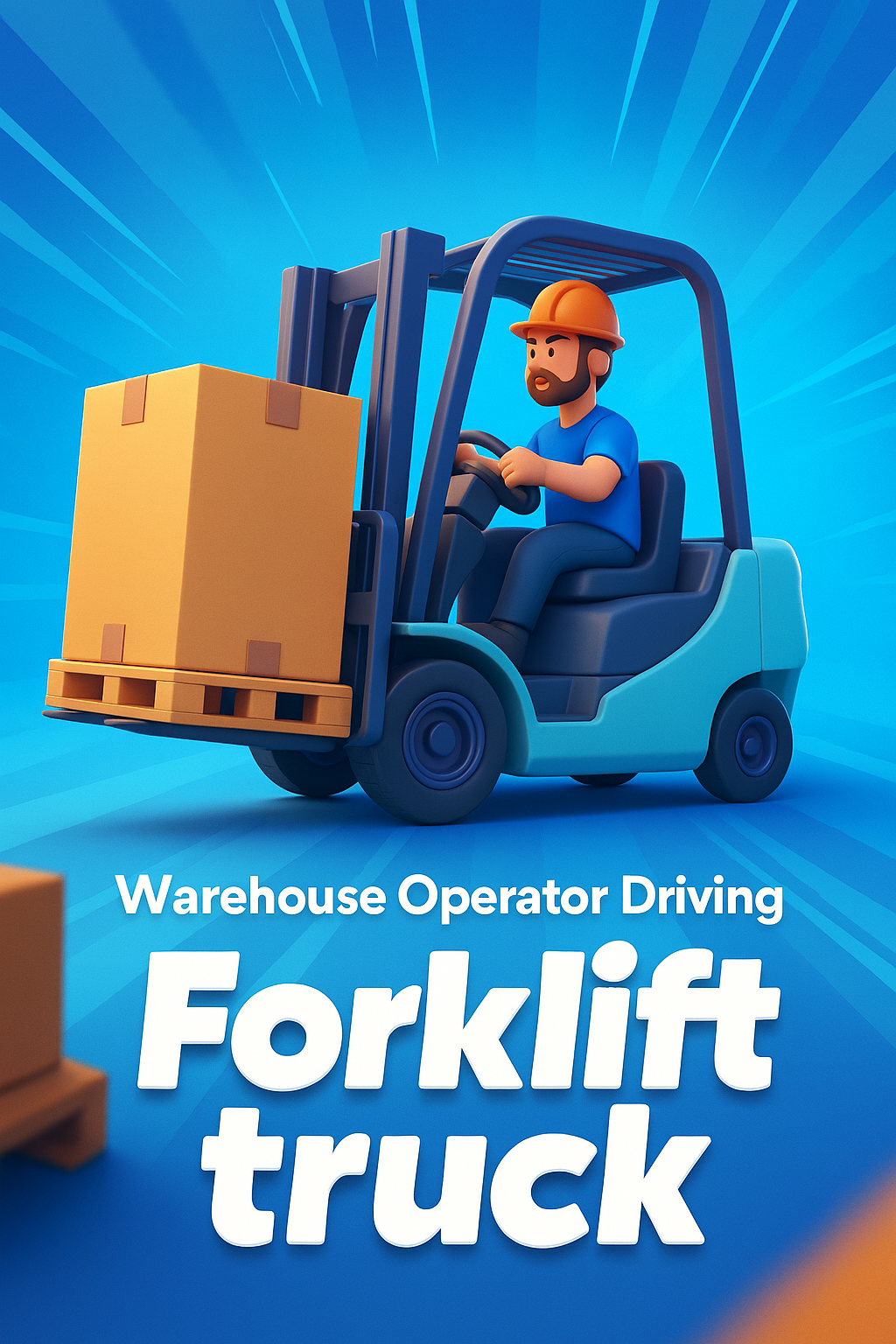 A vibrant illustration of a warehouse operator skillfully driving a forklift truck, surrounded by dynamic lines and a smooth gradient background, emphasizing motion and energy.