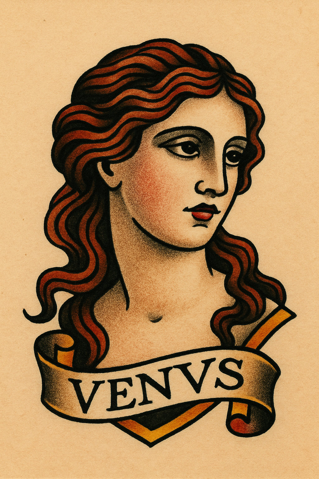 /Collection: /by davooda/Type: PNG/This image features a stylized depiction of Venus in a vintage tattoo art style. The use of bold lines and rich colors highlights the beauty and elegance of the figure.