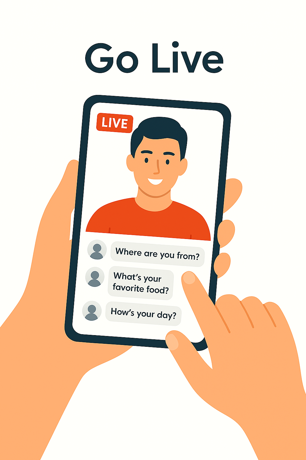 /Collection: /by davooda/Type: PNG/A digital illustration depicting a user interface for live streaming, showcasing a person and interactive chat options. Ideal for social media or tech-related content.