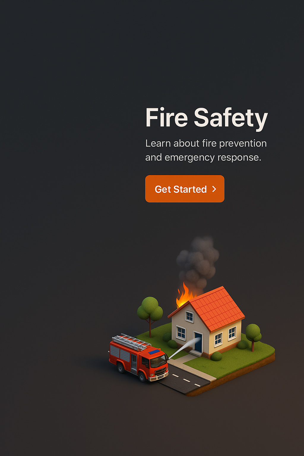 /Collection: /by davooda/Type: PNG/A zoomed-out 3D scene depicting a fire safety theme, featuring a small house with smoke and a fire truck. The dark gradient background accentuates the vibrant colors of the elements, with clear text and a call-to-action button.