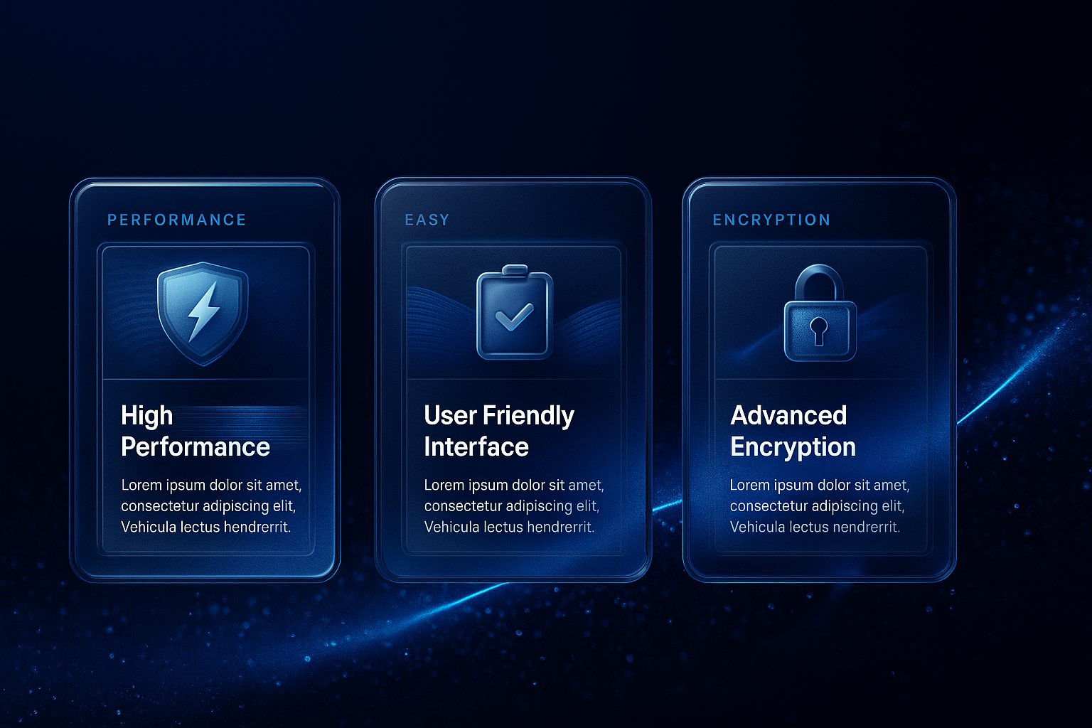 /Collection: /by davooda/Type: PNG/This image features a dark blue abstract background with glowing particles. It includes three informational blocks highlighting features like performance, ease of use, and encryption, with a modern design.