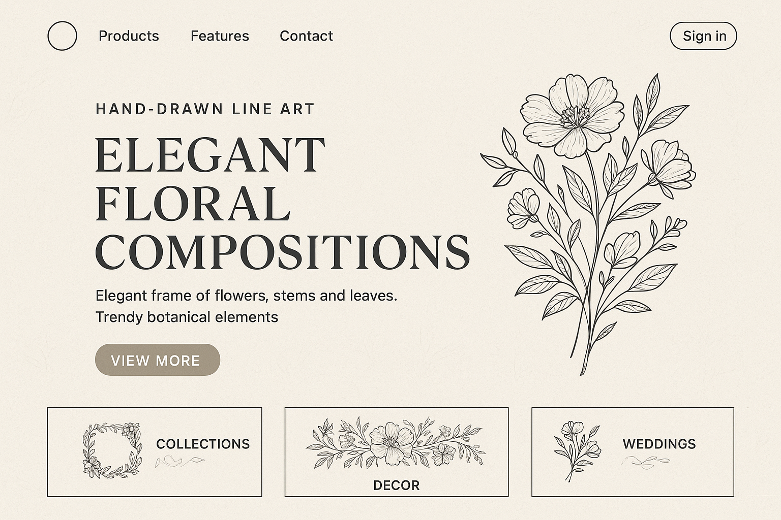 /Collection: /by davooda/Type: PNG/A modern landing page featuring hand-drawn floral compositions in line art style. The layout includes a bold headline, elegant typography, and a clean background.