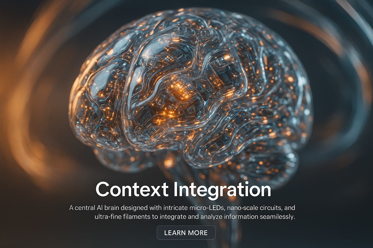 /Collection: /by davooda/Type: PNG/A hyperrealistic depiction of a central AI brain featuring intricate micro-LEDs and sculpted from glass-like polymers. The image showcases glowing components and energy shields, emphasizing high-tech aesthetics.