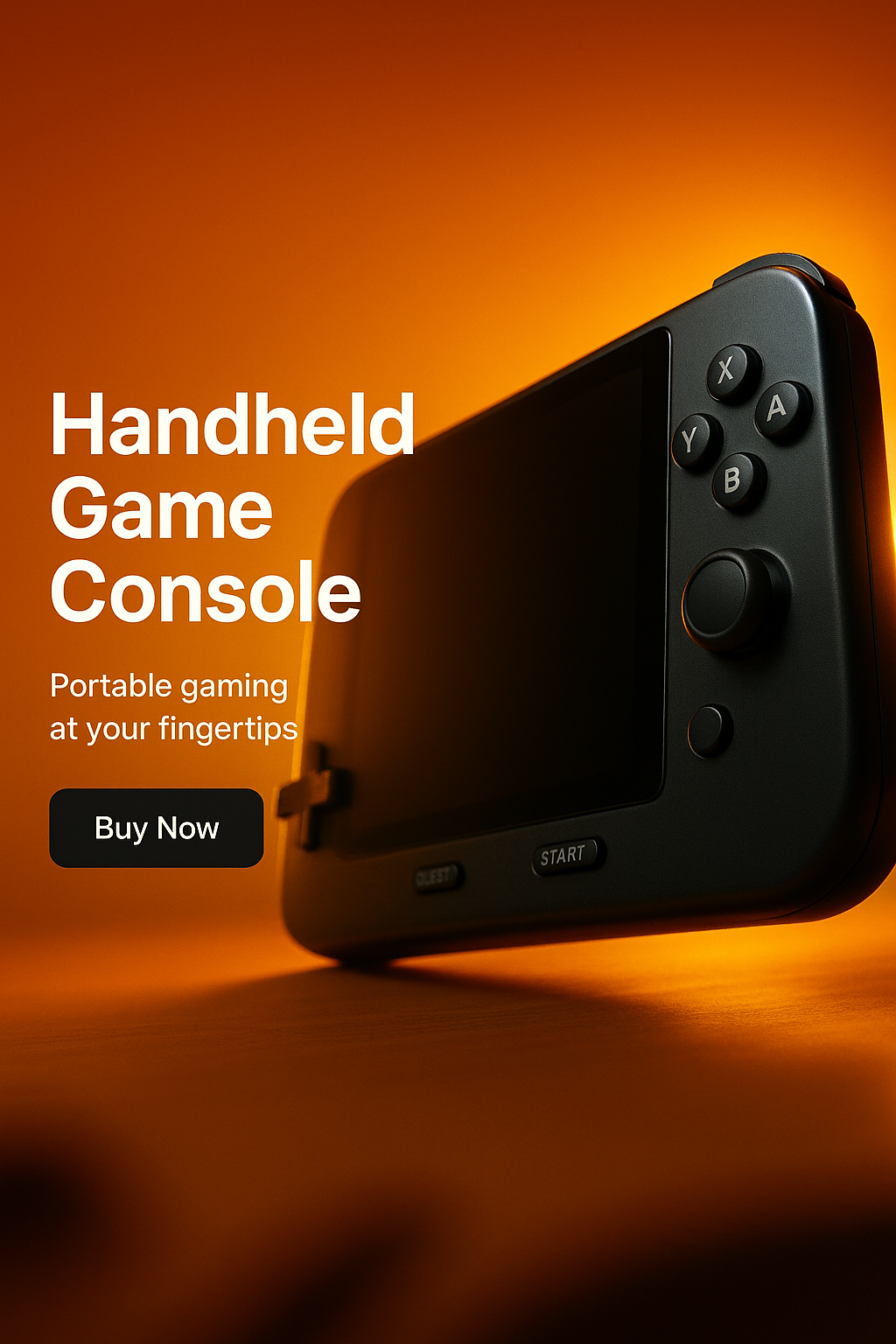 A promotional image featuring a handheld game console against a warm orange background. The modern design and focus on usability highlight portable gaming, intended for gaming enthusiasts.