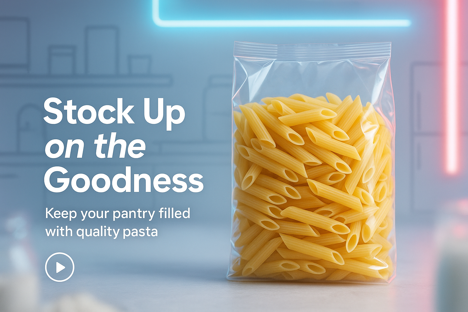 /Collection: /by davooda/Type: PNG/A visually appealing image of a clear plastic bag filled with penne pasta, designed for a promotional campaign encouraging pantry stocking. The modern aesthetic features soft lighting and a minimal background.