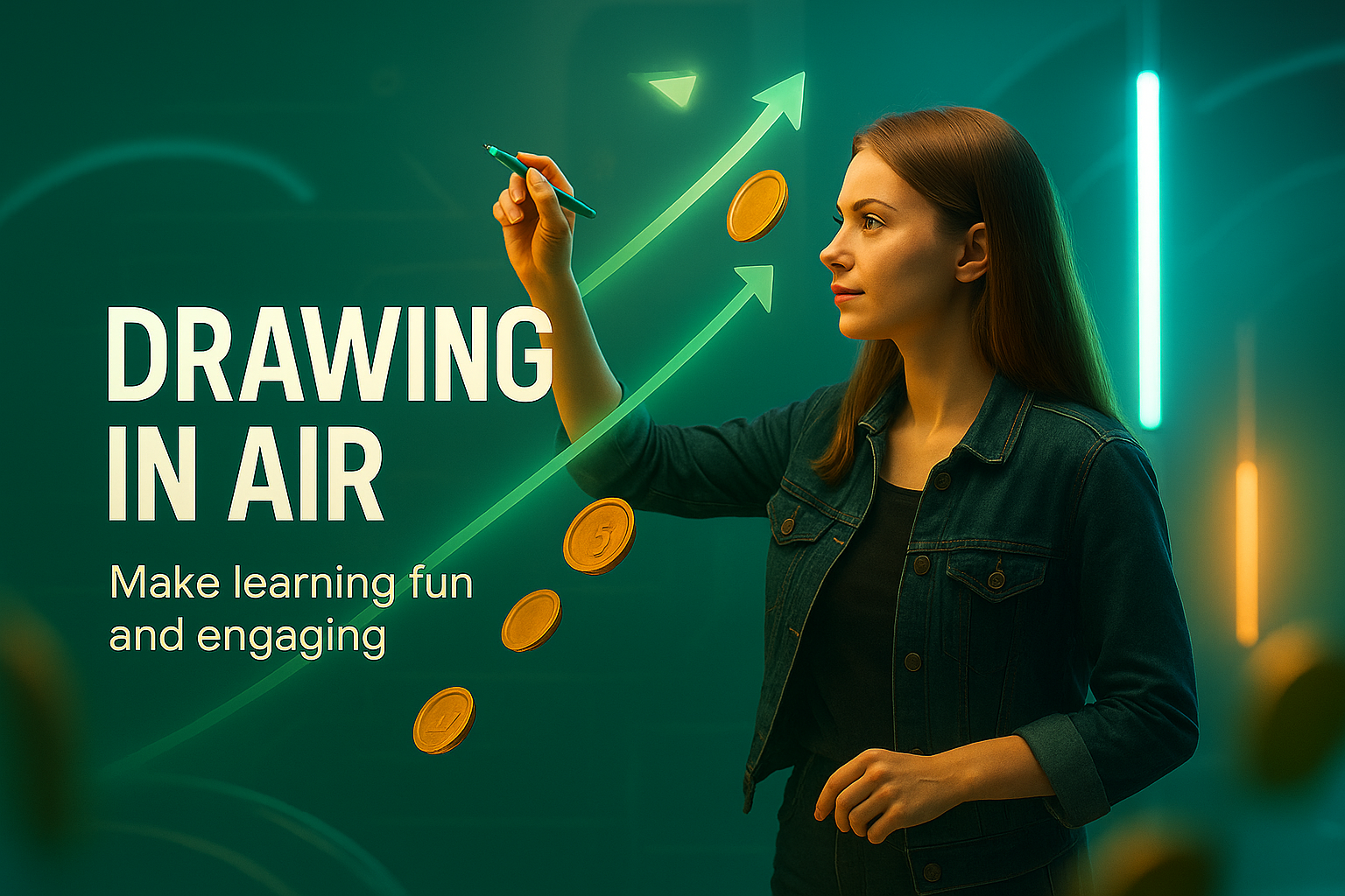 A visually captivating image illustrating a young woman engaging in drawing in the air with a digital pen, symbolizing innovative and interactive learning methods. Ideal for educational marketing.