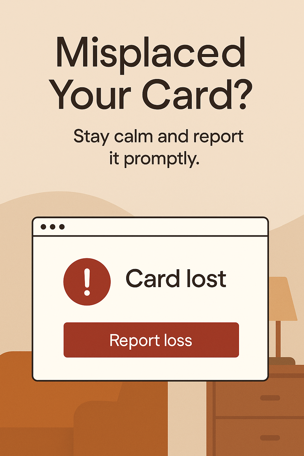 A digital illustration emphasizing the steps to report a lost card. Featuring a simplified computer interface, it uses warm colors and clear typography, making it suitable for customer service communications.
