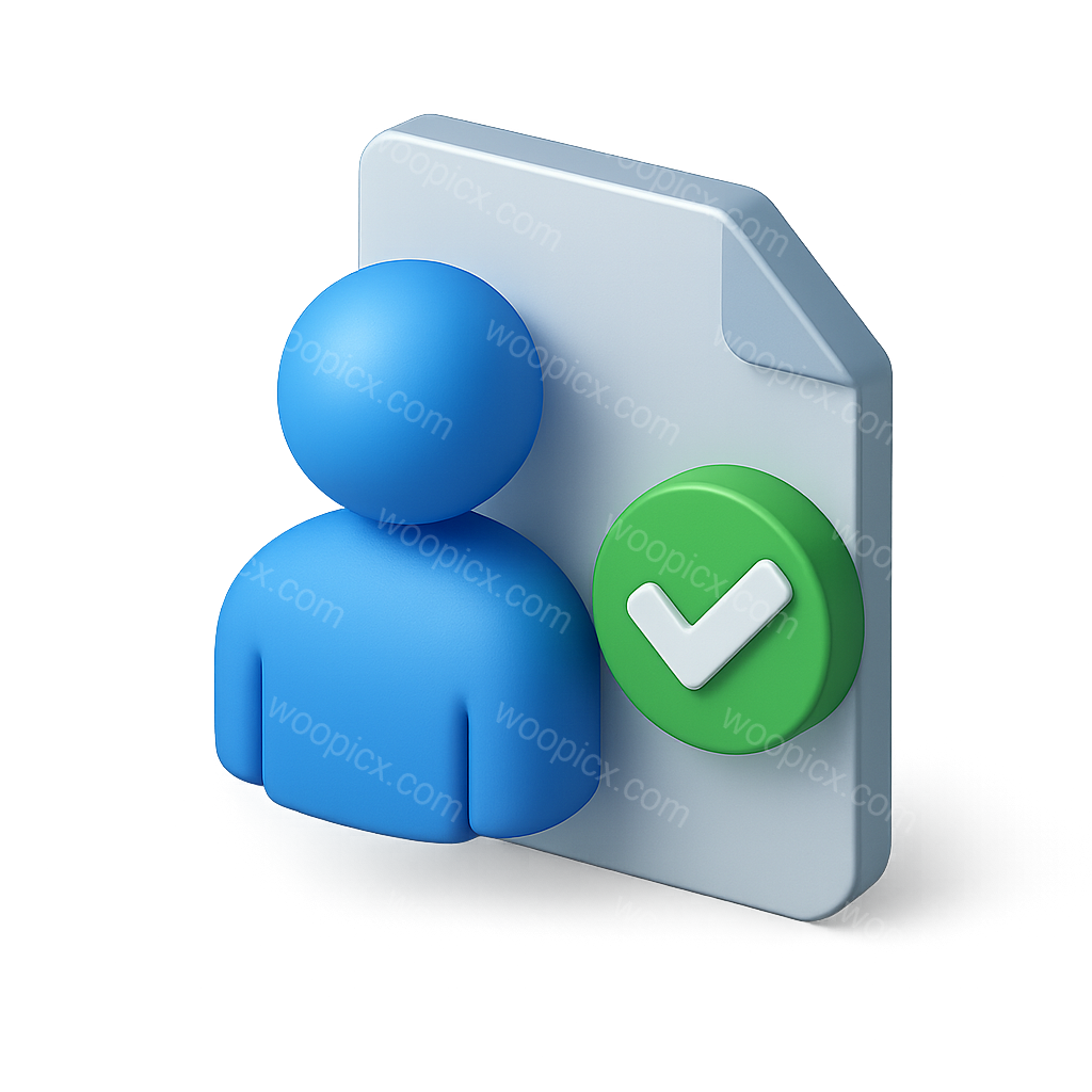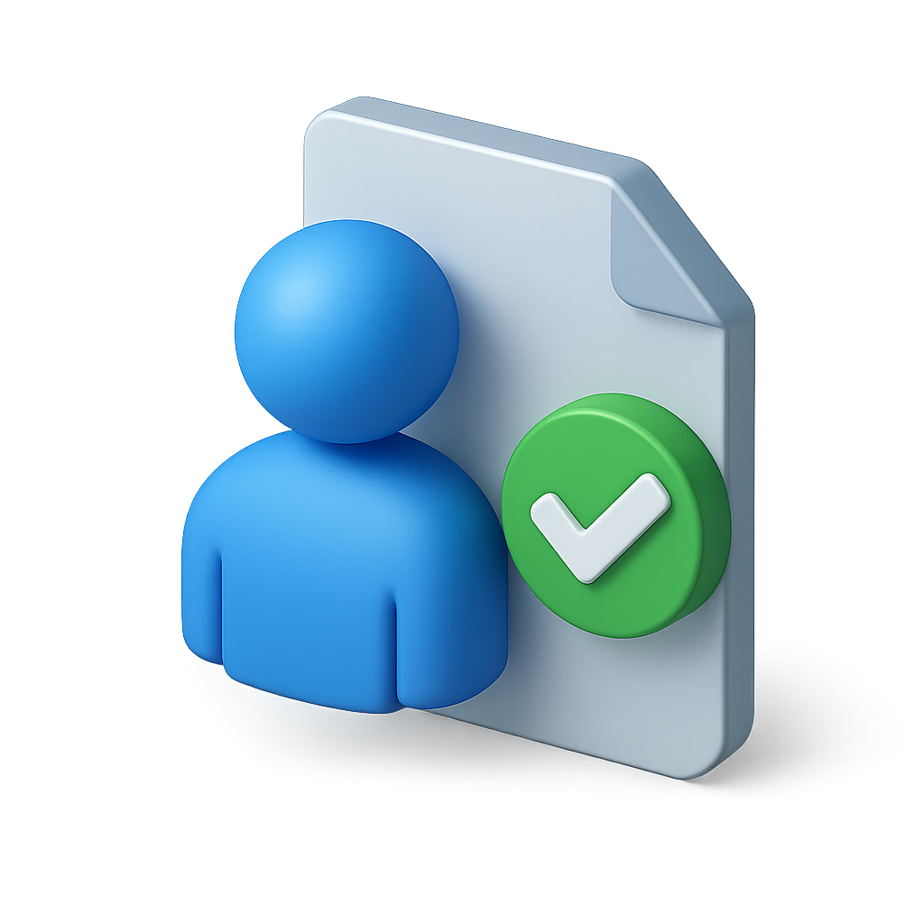A 3D icon featuring a blue user figure alongside a green checkmark on a document-like shape, designed in an isometric view with a transparent background.