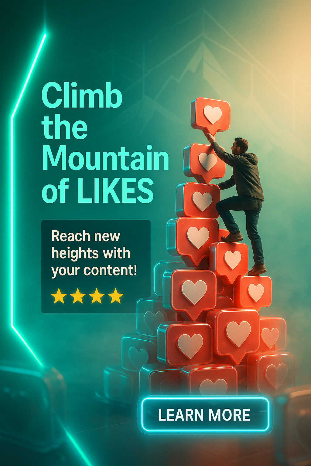 Engaging Promotional Graphic Featuring a Man Climbing a Heart Mountain