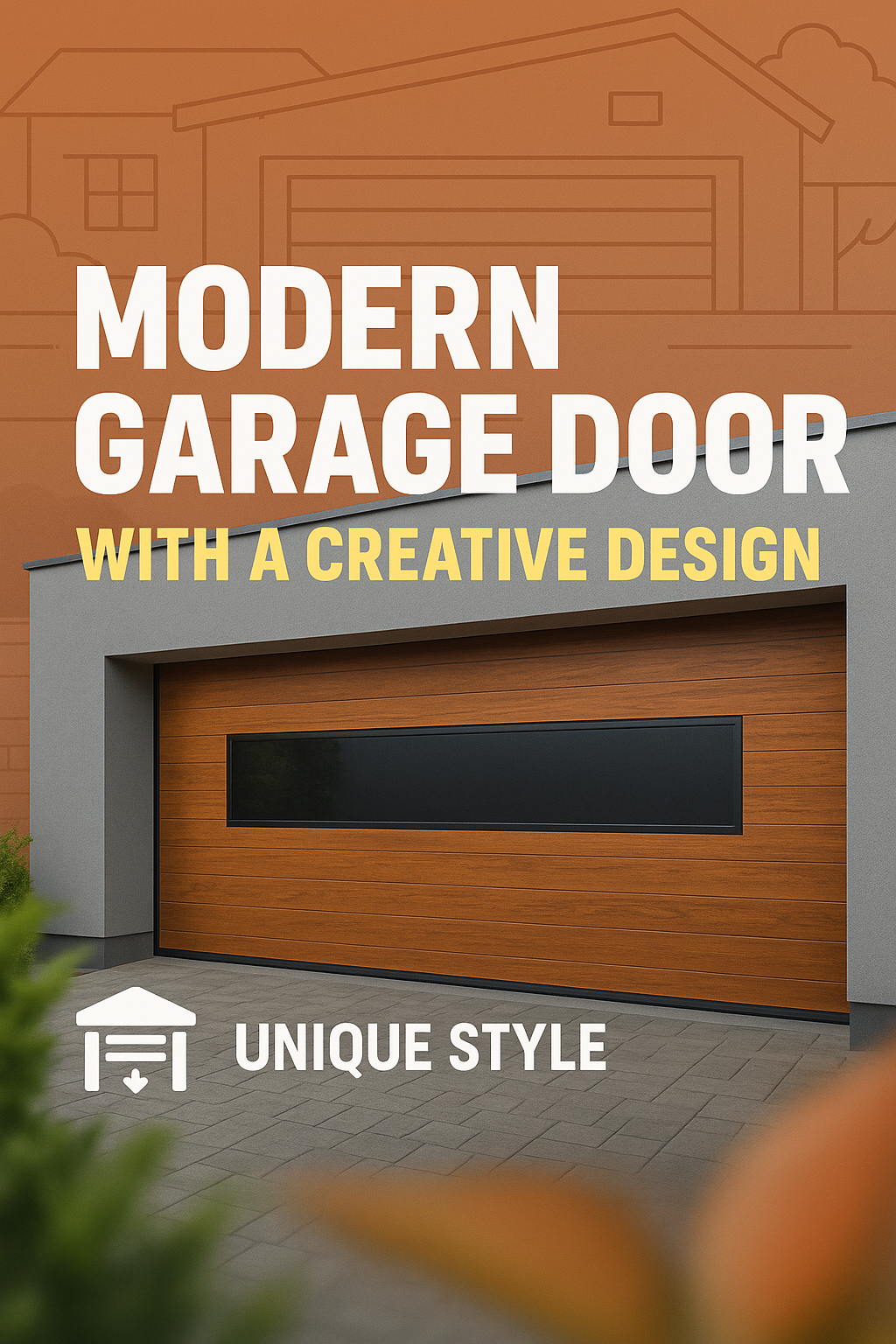 Promotional image featuring a modern garage door with a unique design, ideal for home improvement marketing and architectural showcases.